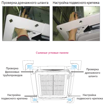 Съемные угловые панели упрощают настройку подвесного крепежа и проверку дренажного шланга на предмет утечек.